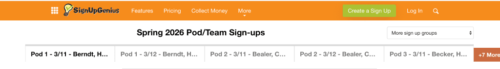 Any Eyer family that is interested in scheduling a conference should use the following Eyer 2026 Spring Conference Sign-Up Link to sign up for a conference time. Families interested in scheduling a conference should navigate to their students Teaching POD using the tabs located directly under the Spring 2025 – Pod/Team Conferences text at the top of the Sign Up Genius Webpage as noted in the screenshot below.