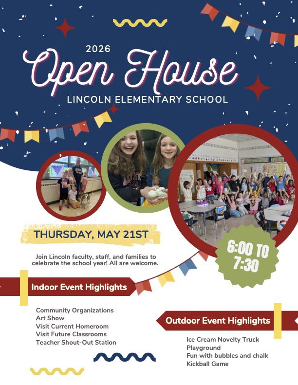 All Lincoln students and families are invited to attend our spring open house. Open house will be held on Thursday, May 21st from 6:00 – 7:30. This year’s event will include both indoor and outdoor highlights, weather permitting.